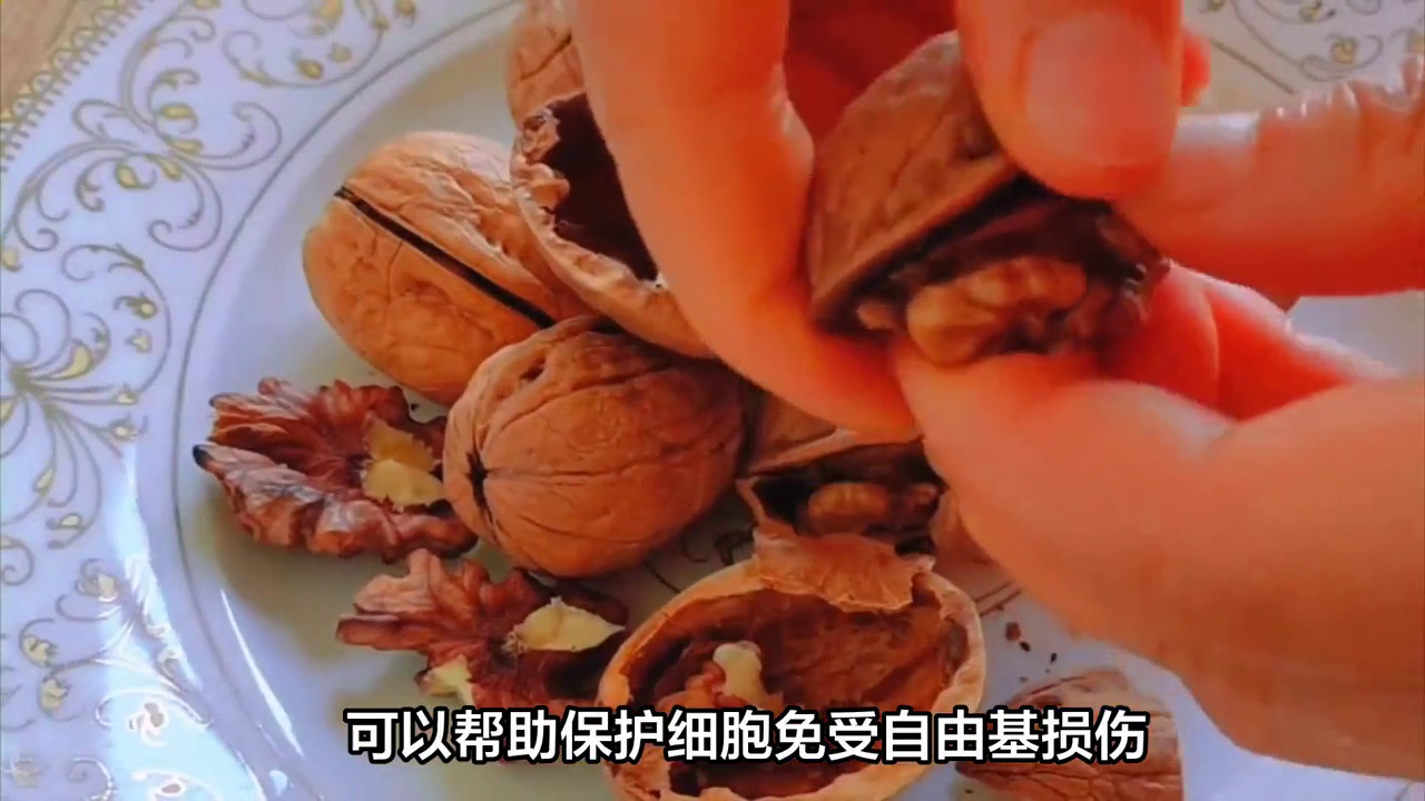 6.核桃——富含单不饱和脂肪、多不饱和脂肪、蛋白质、膳食纤维、维生素和矿物质,可以有效地降低胆固醇、控制血糖、促进消化和增加饱腹感。核桃中的抗氧化剂可以有效地保护细胞免受自由基的损害,从而延缓衰老。