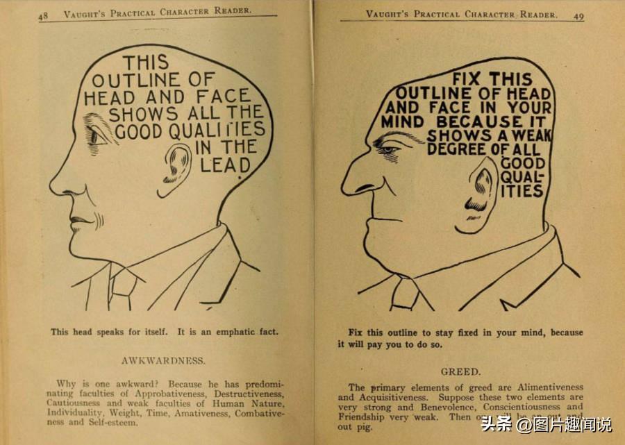02:颅相学是一种通过阅读头骨形状来发现他们性格和智力的做法,在19世纪的美国和欧洲风靡一时,但现在看这几乎是完全的伪科学。在1902年的古老颅相学图表声称揭示了哪种头部形状代表哪种性格特征,比如这幅品质好的人和品质差的人的头颅对比。