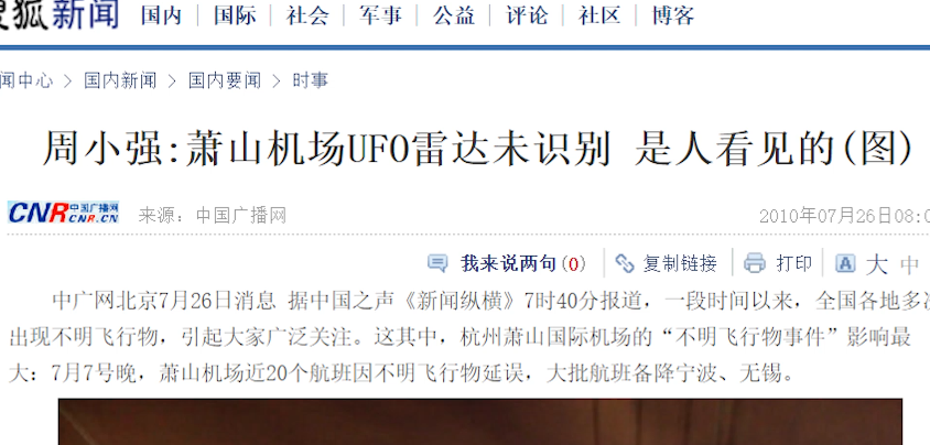 于是很快关于萧山机场出现UFO的消息,通过互联网的传播,迅速在全国各地引起了巨大的轰动。