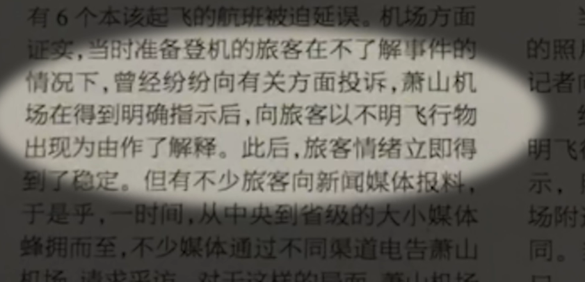 因为在12年前的萧山日报中,有文字明确显示,萧山机场在得到明确指示后,以不明飞行物出现为由,向被延误的旅客进行了解释。